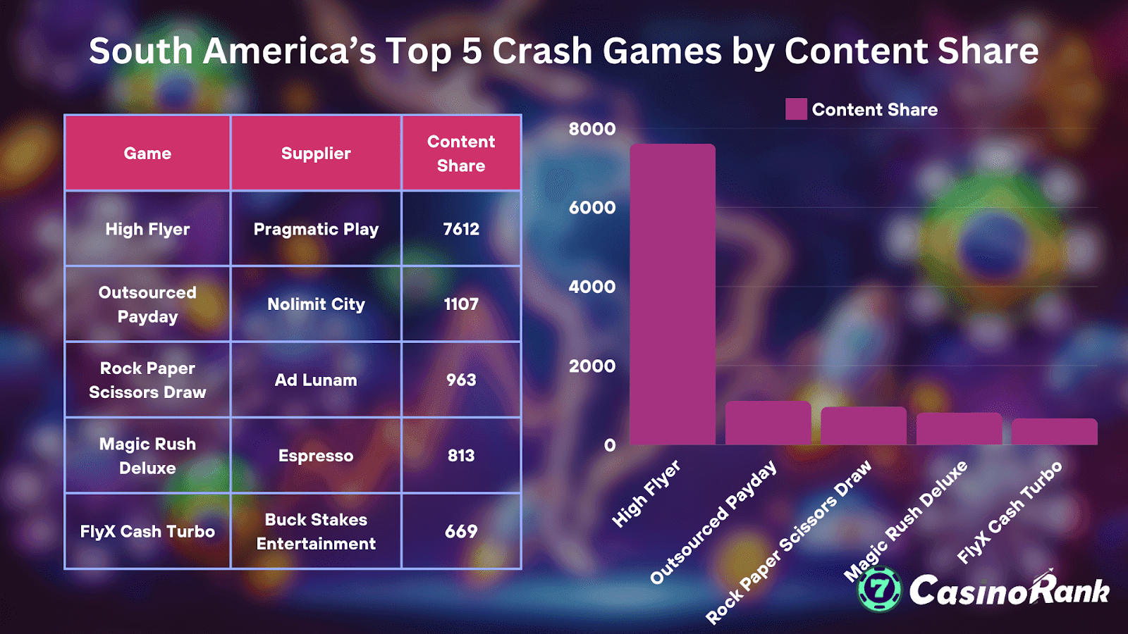 남미에서 충돌 게임은 혁신과 지역적 특색이 어우러진 독특한 영역을 구축해 왔습니다. 프래그매틱 플레이의 하이 플라이어(High Flyer)는 광범위한 유통망을 통해 선두를 달리고 있는데, 이는 라틴 아메리카 통신사들과의 탄탄한 파트너십 덕분에 다양한 유저들이 게임을 접할 수 있게 되었기 때문입니다. 하이 플라이어가 역동적인 게임플레이로 시장을 장악하고 있는 가운데, 놀리밋 시티의 아웃소싱 페이데이(Outsourced Payday) 또한 상당한 영향력을 보여주고 있습니다. 흥미로운 점은 아틀라스 V의 포뮬러 1(Formula 1)과 같은 축구 테마 게임들은 상대적으로 저조한 성적을 거두었다는 것인데, 이는 남미 지역에 아직 잠재력이 충분히 발휘되지 않았음을 시사합니다.